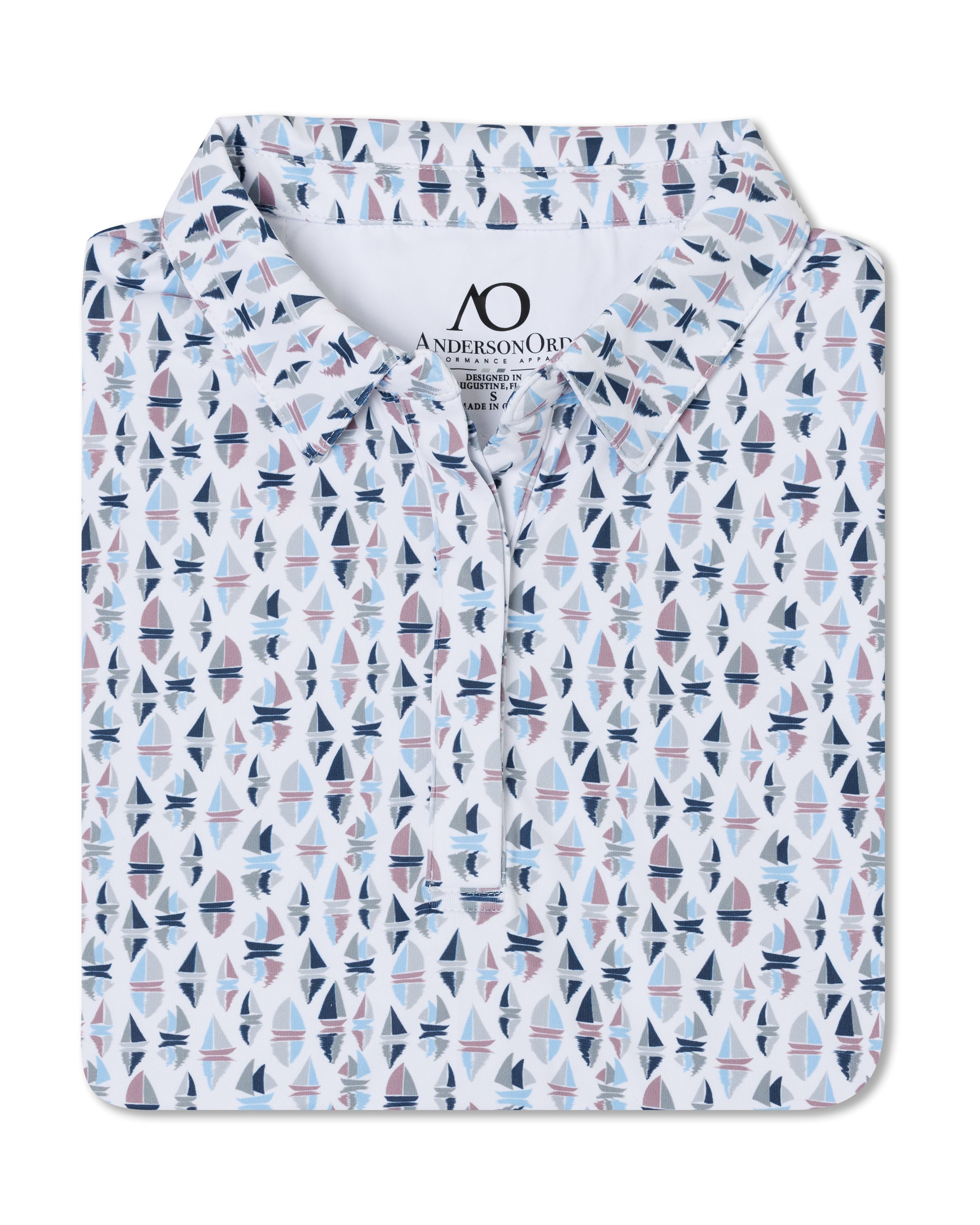 The Seafarer polo features a fun, multi-colored print of sailboats reflecting on clear waters.